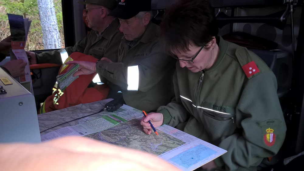 Ab 8:00 Uhr galt es vier Orientierungs-Aufgaben zu lösen, die optimal von der FF Breitenau vorbereitet wurden. Das Aufsuchen einer Jagdhütte Richtung Schoberstein, das Anfahren eines Objekts im Hausbach (mit einsatztaktischen Fragen),  das Ermitteln eines Zielpunktes mit der Angabe von Richtung und Entfernung sowie das Aufsuchen einer konkreten Adresse beschäftigte die Mannschaft der FF Molln, die mit unserem RLF-A unterwegs war. Vor allem für den Kraftfahrer stellen die Forstwege teilweise eine Herausforderung dar.