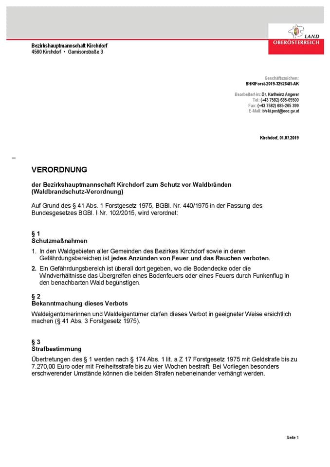 (1) In den Waldgebieten aller Gemeinden des Bezirkes Kirchdorf sowie in deren Gefährdungsbereichen ist jedes Anzünden von Feuer und das Rauchen verboten.