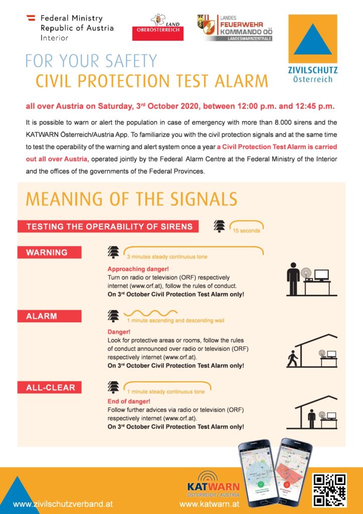 Am Samstag, den 3. Oktober 2020, wird wieder ein bundesweiter Zivilschutz-Probealarm durchgeführt. Zwischen 12.00 und 12.45 Uhr werden nach dem Signal „Sirenenprobe“ die drei Zivilschutzsignale „Warnung“, „Alarm“ und „Entwarnung“ in ganz Österreich ausgestrahlt.