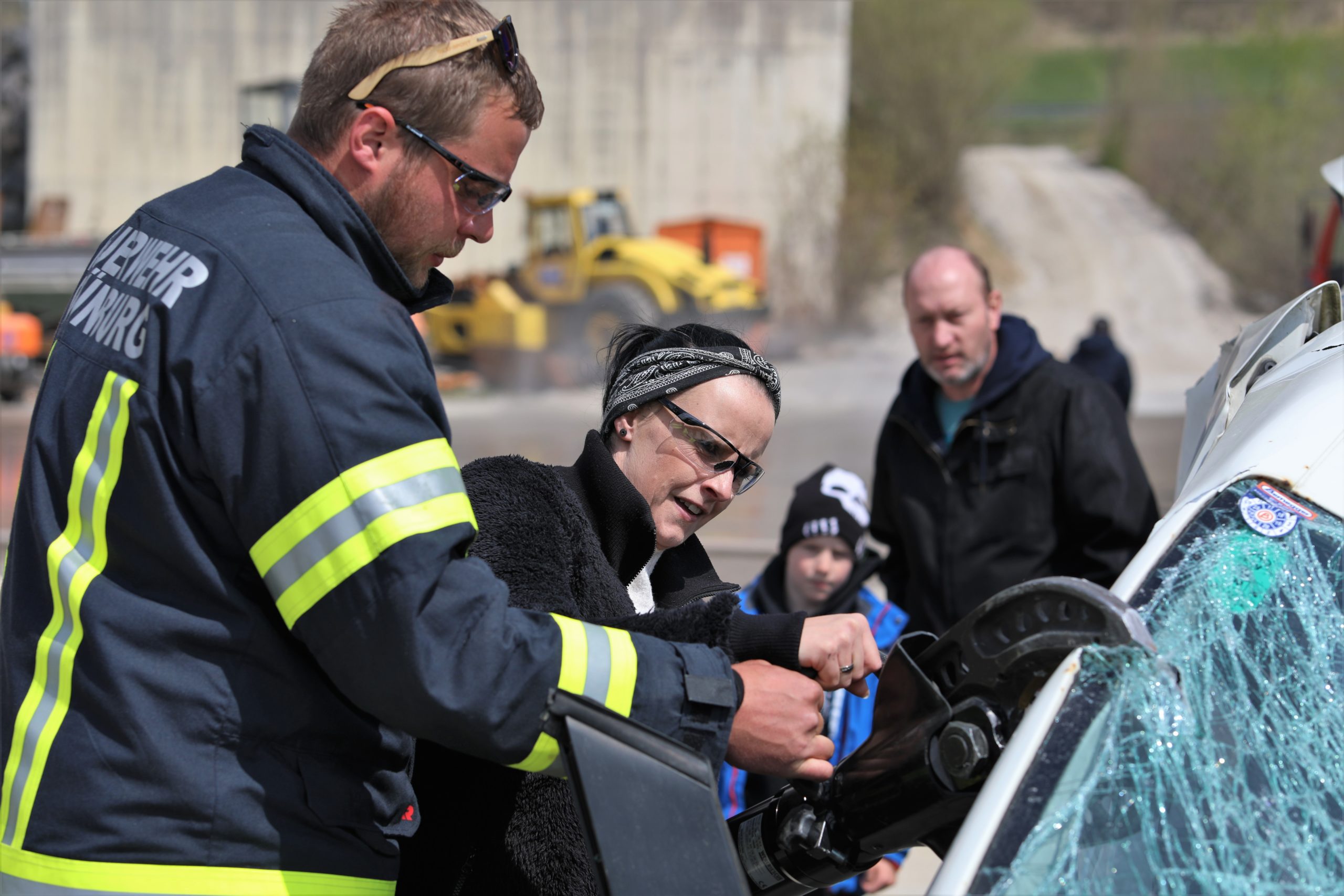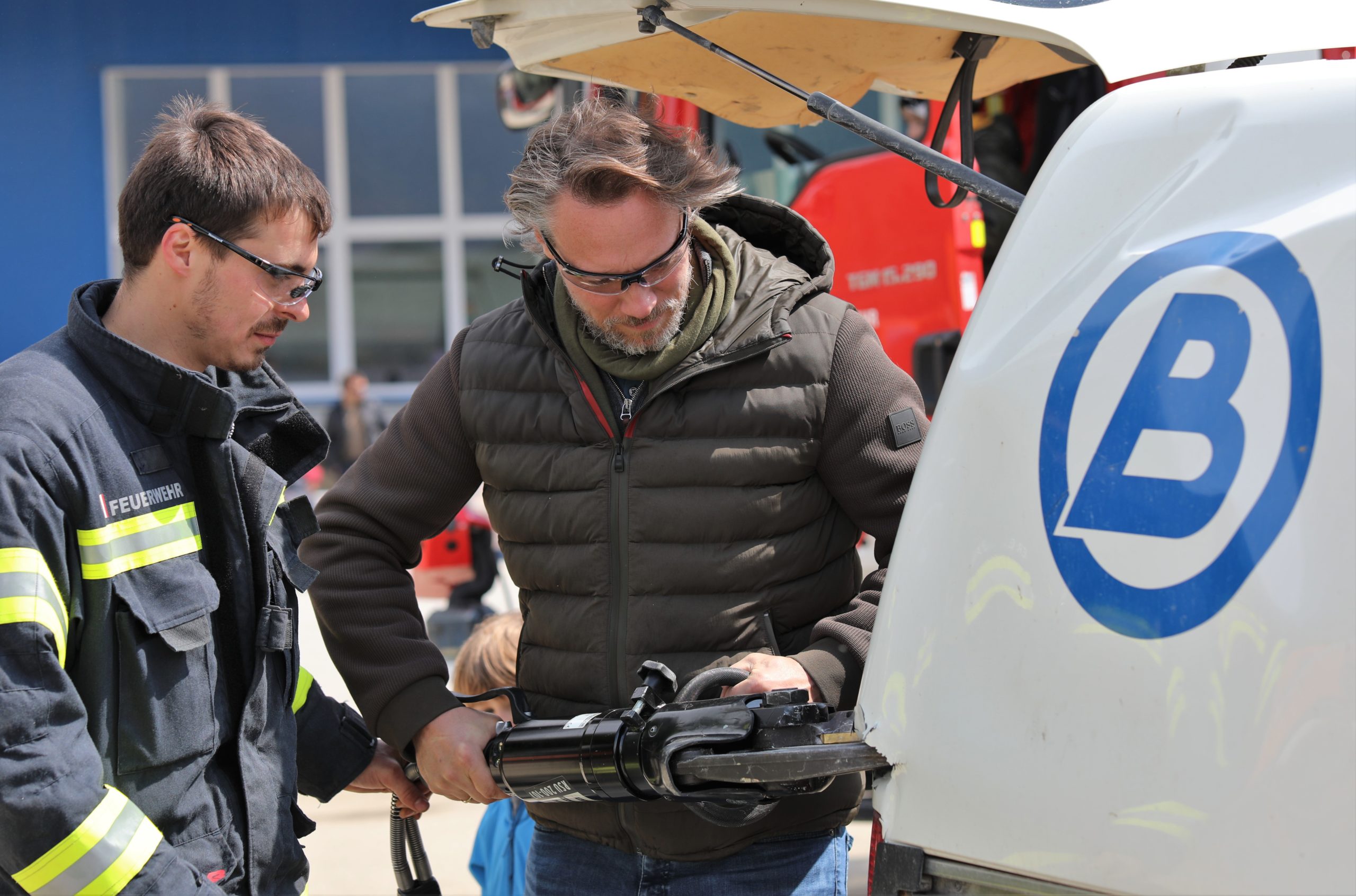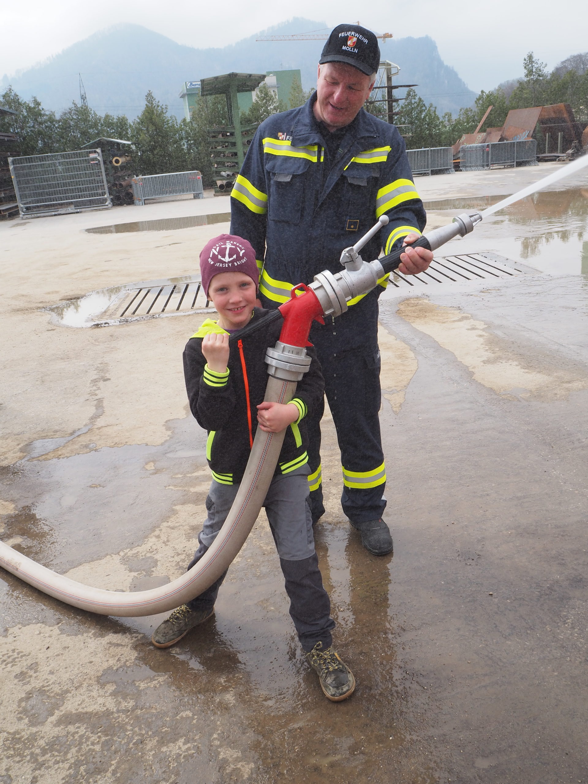 Bei den Mitmachen-Stationen der Mollner Feuerwehren konnte sich Klein und Groß am Strahlrohr und mit Hydraulischem Rettungsgerät versuchen und eine Runde am im Feuerwehrfahrzeug am Werksgelände drehen.