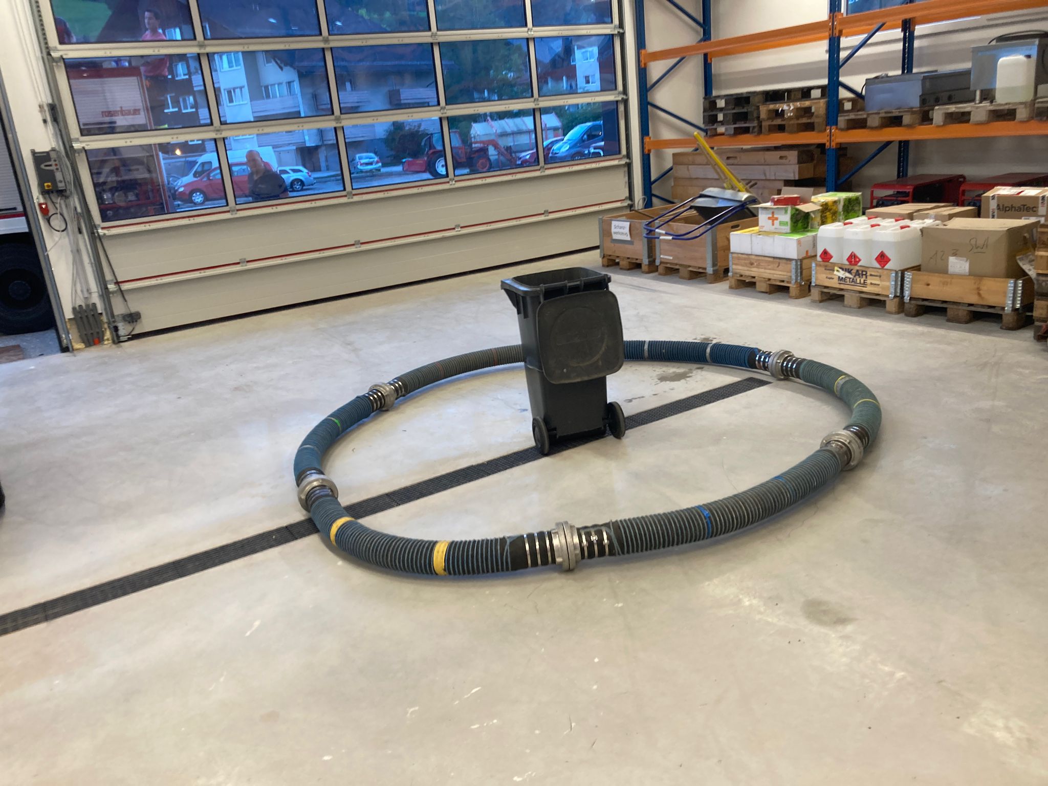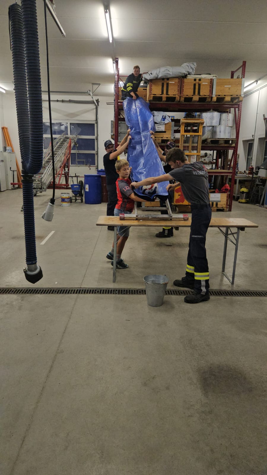 - Am Hochregal (ca. 3 Meter Höhe) liegt ein Ball. Dieser muss in die Garage in einen Kübel gebracht werden. Der Ball darf nur durch einen einmaligen Stoß in Bewegung gesetzt werden.