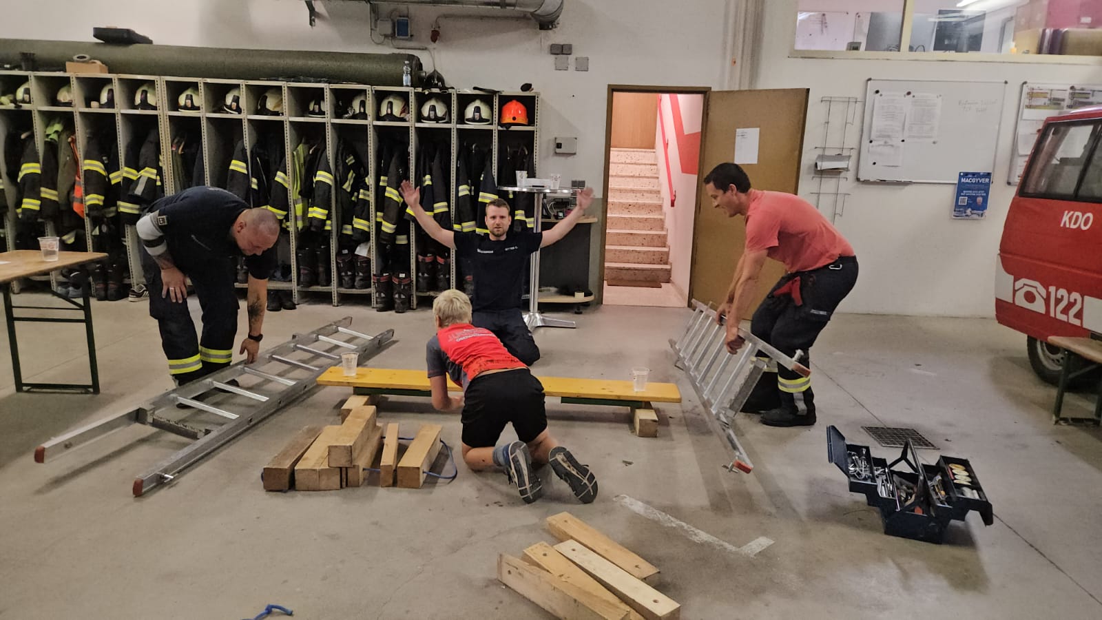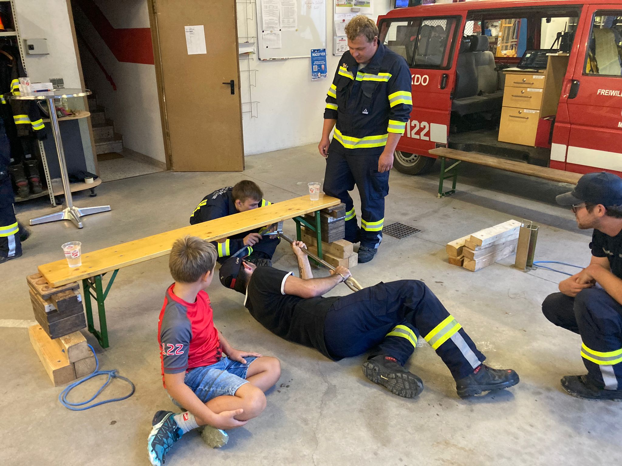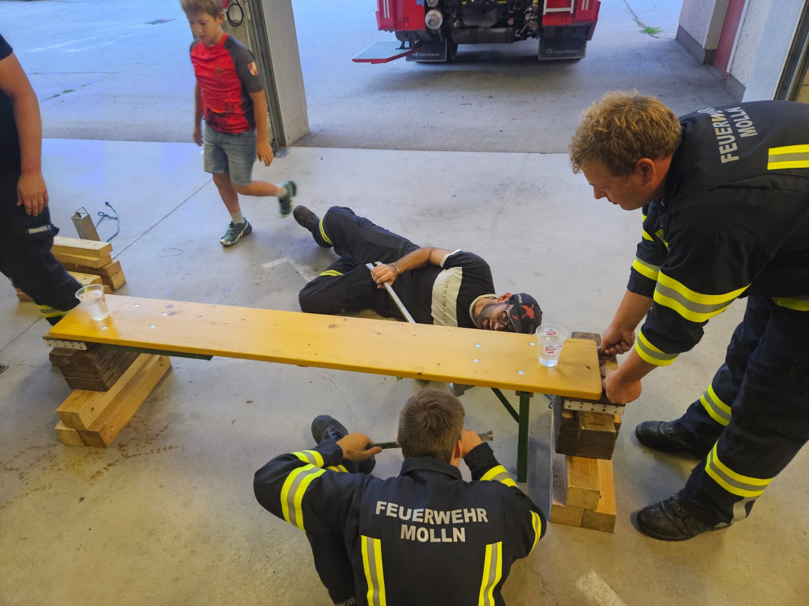 - Eine Bierbank , auf der 2 Wassergläsern stehen soll sicher zusammen gelegt werden (Füße einklappen). Es darf dabei die Bank nicht mit den Händen berührt, verrückt und direkt gehoben werden.