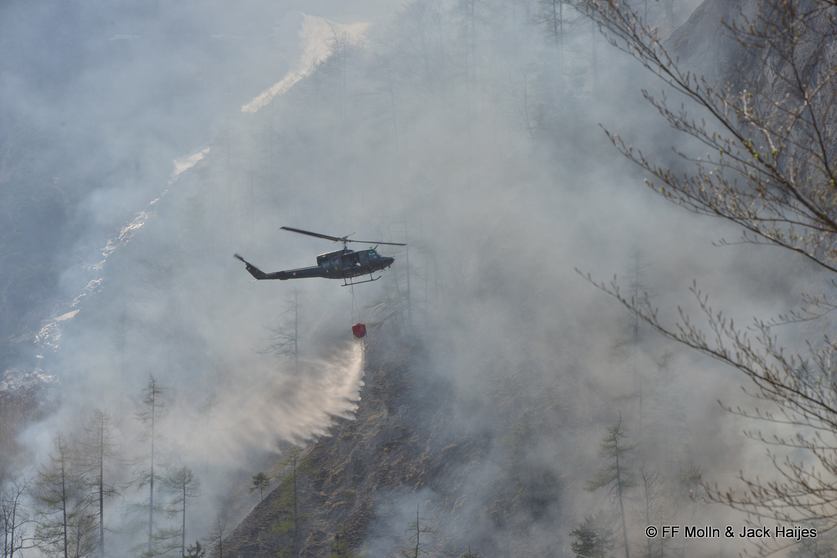 Abgelenkte Munition eines Maschinengewehrs flog rechts im Wald und verursachte ein Brand. Am Freitag, 26. April 2013 wurden 6 Feuerwehren durch den Landeswarnzentrale Alarmiert: Brand Baum, Flur, Böschung in der Ramsau. Der Einsatz war extrem mühsam, so der Kommandant der Feuerwehr Molln, Robert Mayrhofer. Der Waldbrand breitete sich in extrem unwegsamem Gelände in rund 800 bis 900 Meter Seehöhe rasch aus. Die Feuerwehrmänner und Bergrettungsmänner mussten mit Löschrucksäcken in der Steilwand gegen um den Brand zu bekämpfen. Zwei Hubschrauberstaffeln des Bundesheeres aus Hörsching und Aigen im Ennstal wurden angefordert. Sie flogen mit Wassercontainer über den Brand und löschten den Waldbrand. Über hundert Feuerwehrmänner, dutzende Bergretter von zwei Ortsstellen, Soldaten des Bundesheeres und Polizisten waren im Einsatz.
