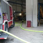 Im Tanklöschfahrzeug und im Rüstlöschfahrzeug rüsteten sich Atemschutzgeräteträger bereits auf der Anfahrt aus. Ein Trupp bekämpfte sofort nach Eintreffen am Betriebsgelände den Brand, der auf die Ausbruchsstelle beschränkt war. Mehrere beschädigte Kanister wurden ins Freie gebracht. Im Anschluss wurde der betroffene Raum und die Werkstättenhalle intensiv belüftet. Nach etwas 30 Minuten konnte die Werkstatt wieder großteils frei gegeben werden. Der anwesende Brandschutzbeauftragte des Unternehmens sowie die Polizei dokumentierten die Schäden und ergründeten die möglichen Ursachen.