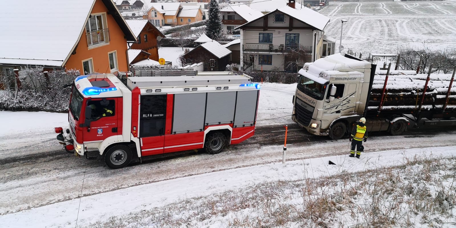 Zuerst galt es im Bereich Zimeck ein Winterdienstfahrzeug zu sichern und zu aus einer misslichen Lage zu befreien. Die FF Molln setzte dabei das Rüstlöschfahrzeug mit Einbauseilwinde ein.