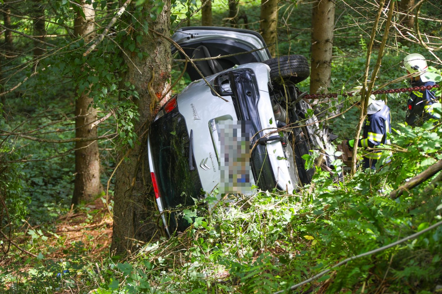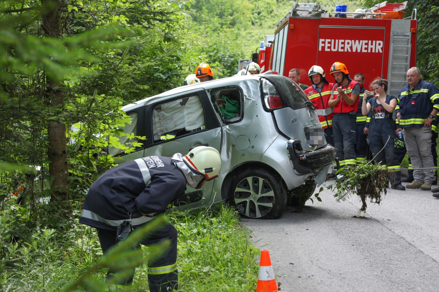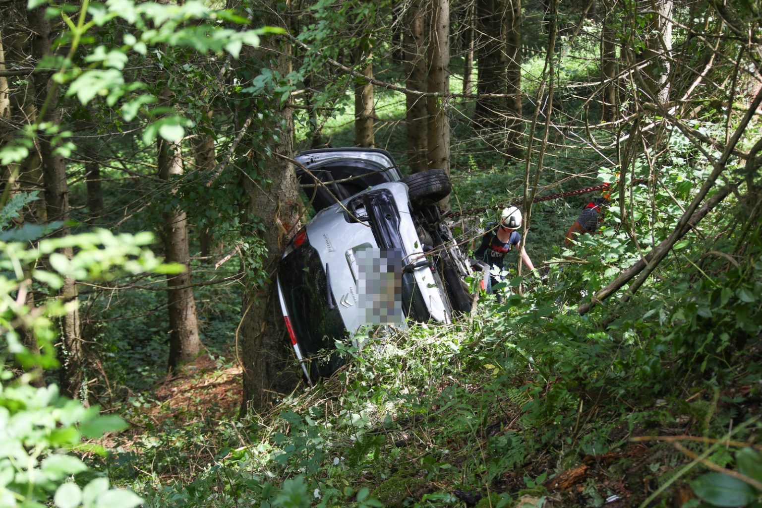 Nur durch lautes, permanentes Hupen waren Anrainer aufmerksam geworden, hielten Nachschau und entdeckten den verunfallten PKW, der von der Strasse aus kaum sichtbar war in einer steilen Böschung.