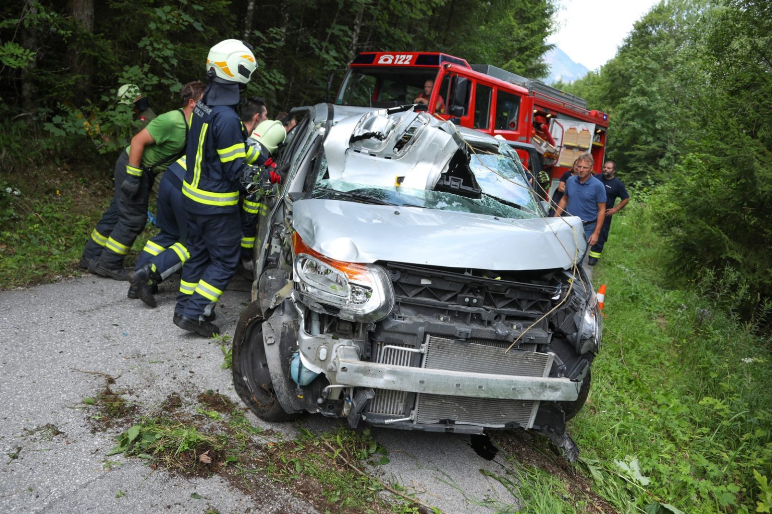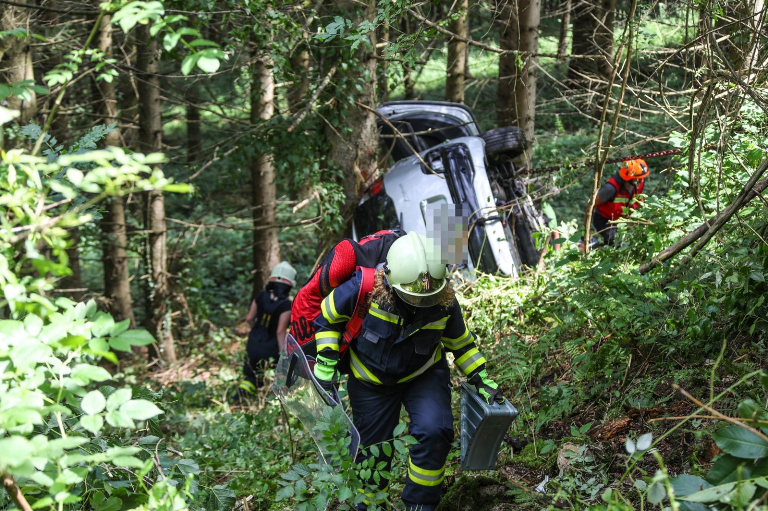 Nachdem das Unfallopfer und der Hund mittels hydraulischem Rettungsgerät und Spineboard aus dem Fahrzeug gerettet und vom Notarztteam für den Transport ins Krankenhaus vorbereitet wurde konnte mit der Rettung aus dem steilen Gelände begonnen werden. Dazu wurde die Schleifkorbtrage und viel Muskelkraft eingesetzt. Der Patient wurde schlussendlich ins LKH Kirchdorf verbracht. Der ebenfalls verletzte Hund wurde in die Tierklink Steyr gebracht.