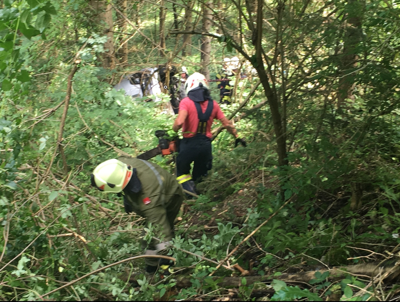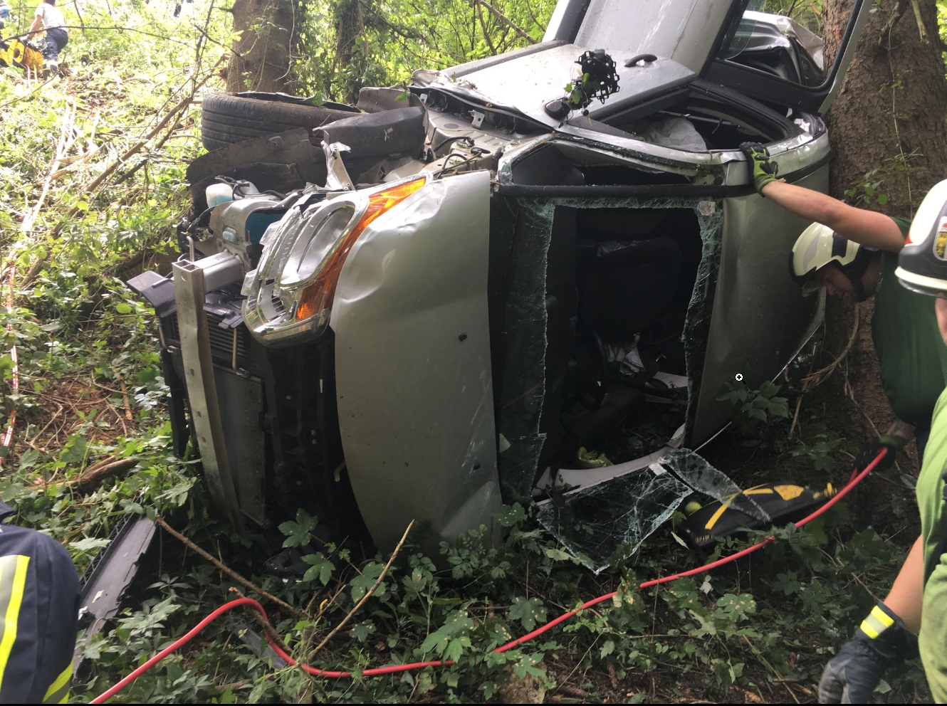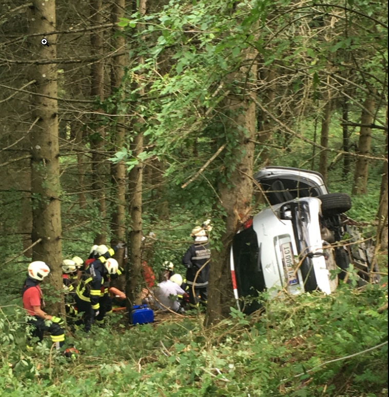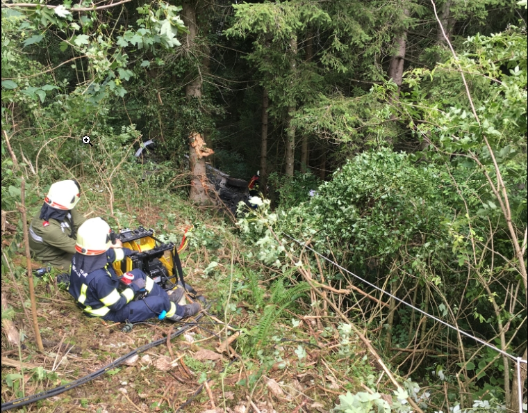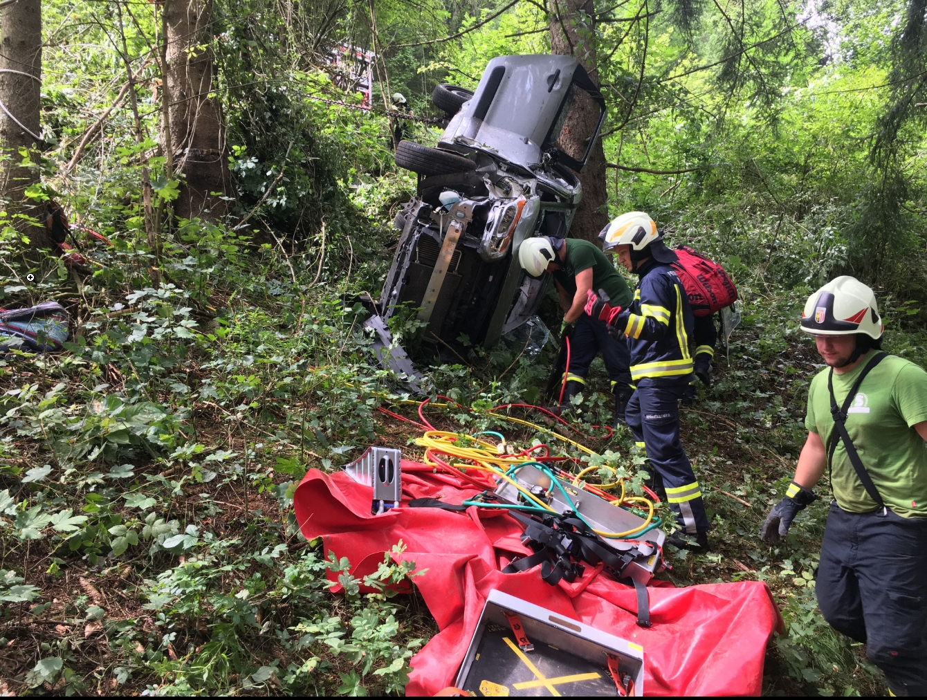Einsatzleiter BI Patrick Kerbl traf weniger Minuten nach der Alarmierung an der Unfallstelle ein und fand folgende Lage vor: Ein PKW war über eine sehr steile Böschung gestürzt, hatte sich überschlagen und war seitlich an einem Baum liegen geblieben. Der Lenker war eingeklemmt und verletzt. Zudem befand sich ein Hund im Fahrzeug.